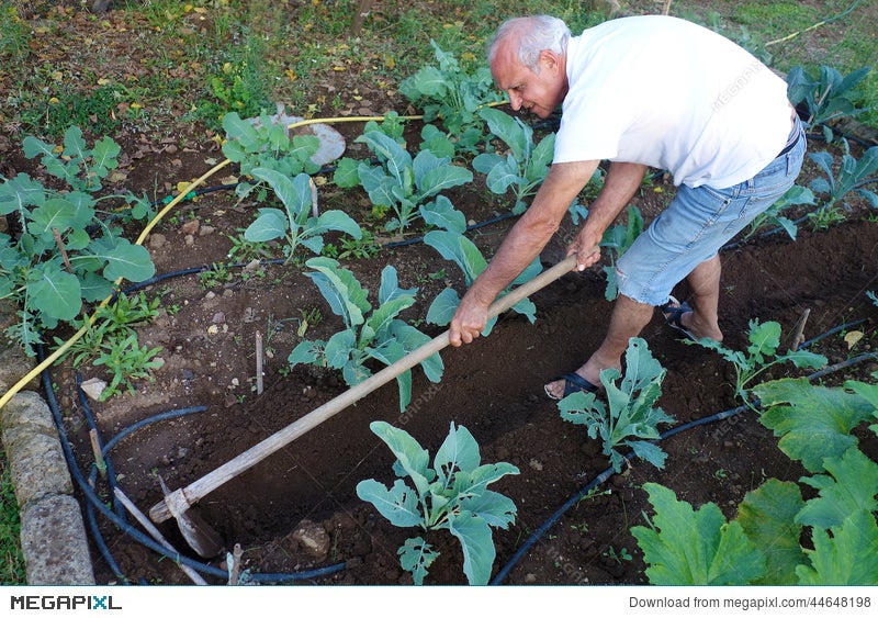 Farmer Working Hoeing Ground Vegetable Garden Stock Photo
