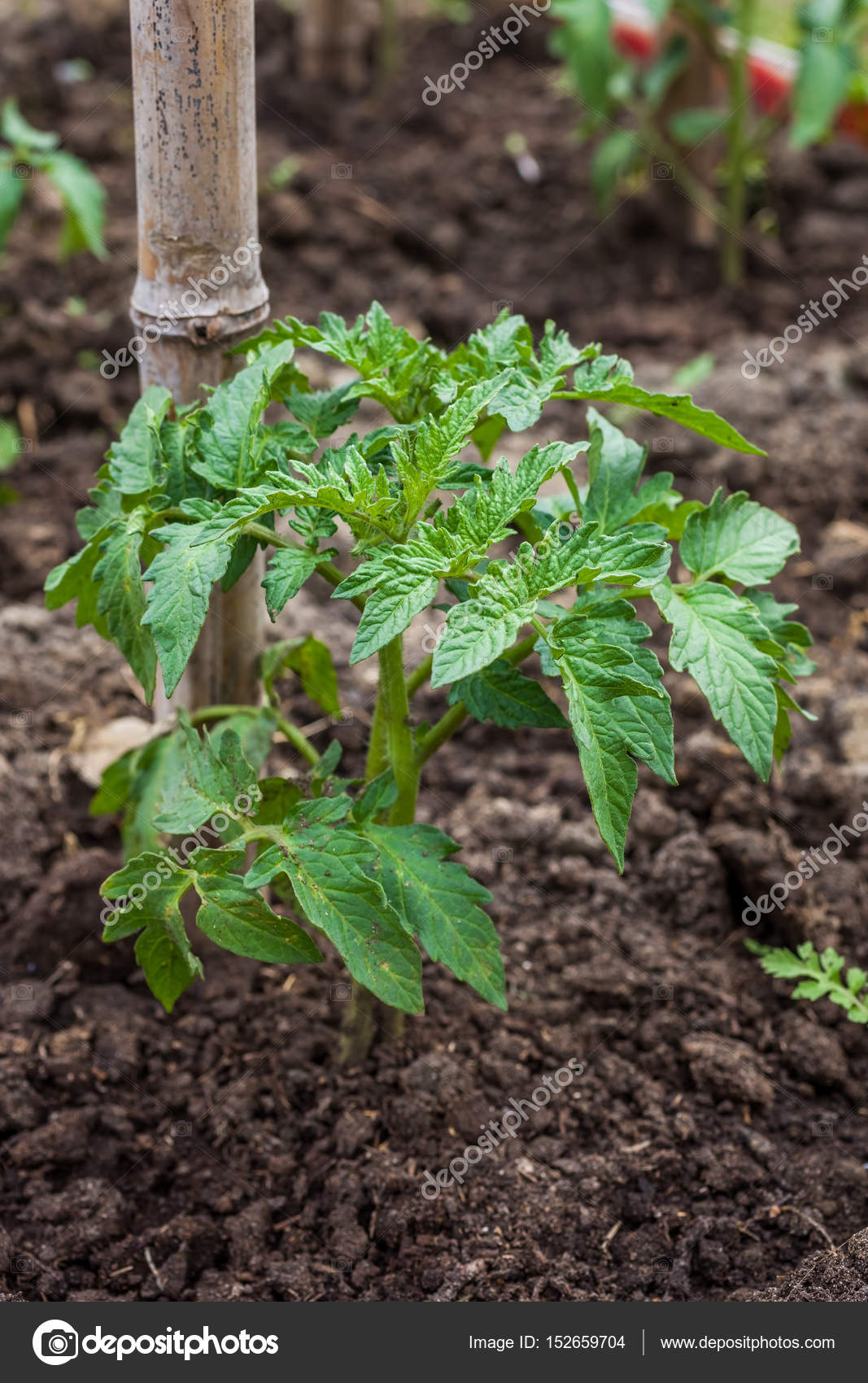 Young Tomato Plant In Open Ground In Vegetable Garden